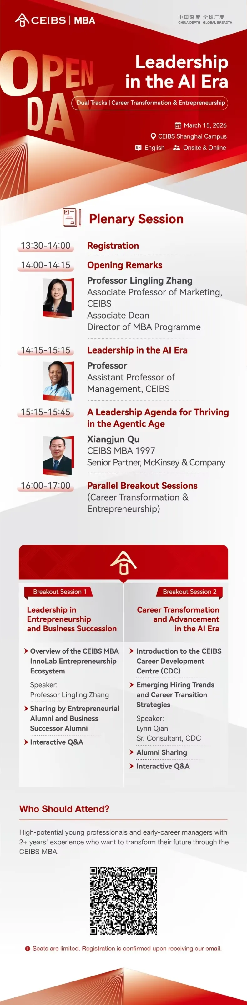 Join CEIBS' Leadership in the AI Era Open Day on March 15, 2026 at the CEIBS Shanghai Campus (onsite & online) for a high-impact MBA preview where China depth meets global breadth. Hear from Professor Lingling Zhang and McKinsey senior partner Xiangjun Qu on leading in the AI age, then dive into two breakout tracks on entrepreneurial leadership and career transformation, featuring alumni stories and live Q&A. Perfect for high-potential professionals with 2+ years’ experience looking to level up their leadership and career game.