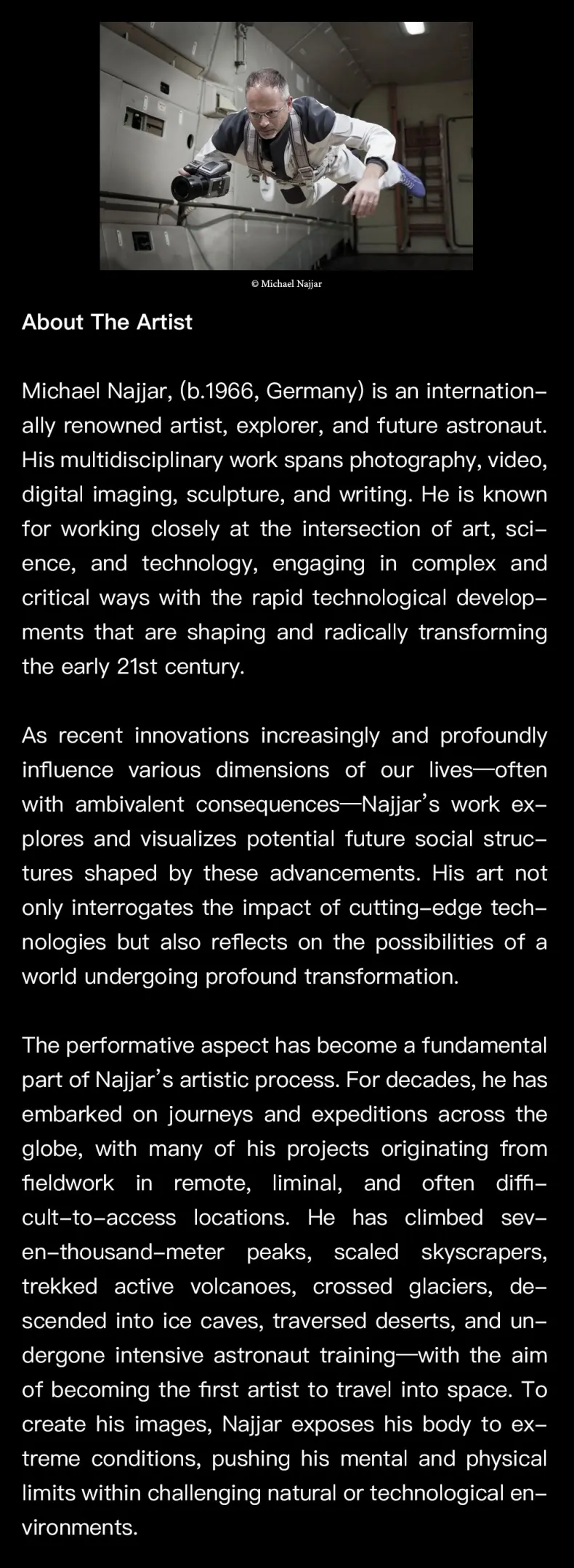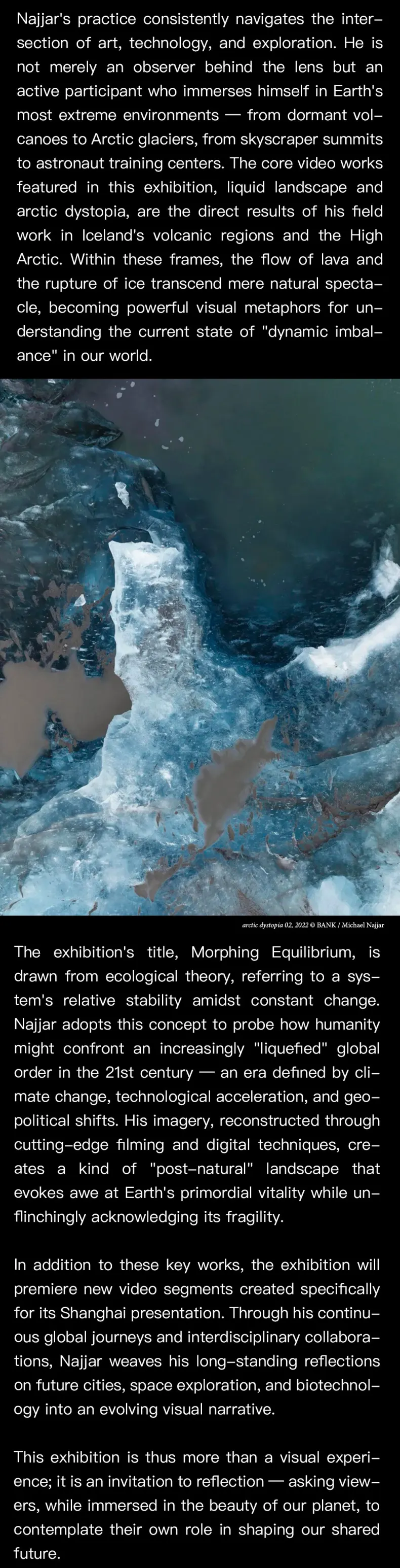 Internationally renowned artist and future astronaut Michael Najjar brings a site-specific exhibition that looks squarely at a planet in flux. Shot in places most people only see on documentaries — Iceland’s volcanic zones and the High Arctic — Najjar’s monumental videos turn lava flows and collapsing ice into stark metaphors for a world out of balance. On view from January 16 to May 17, 2026, it’s less about pretty nature shots and more about what change actually feels like when you’re standing inside it.