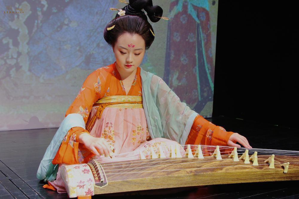 Multimedia elements are used to support the performance, including visual recreations of statues and murals. These elements contribute to an immersive environment designed to reflect the musical and visual culture of the Tang period.