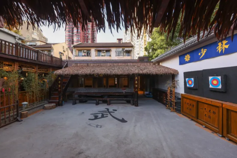 The environment is designed to reflect a traditional Shaolin-style training setting, with a courtyard and wooden hall atmosphere that supports an immersive learning experience.