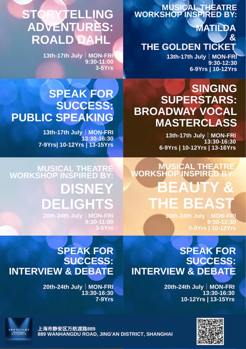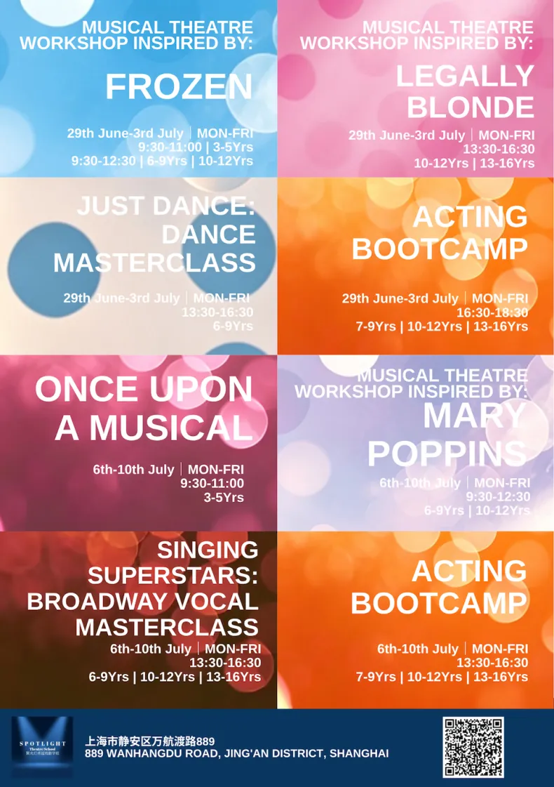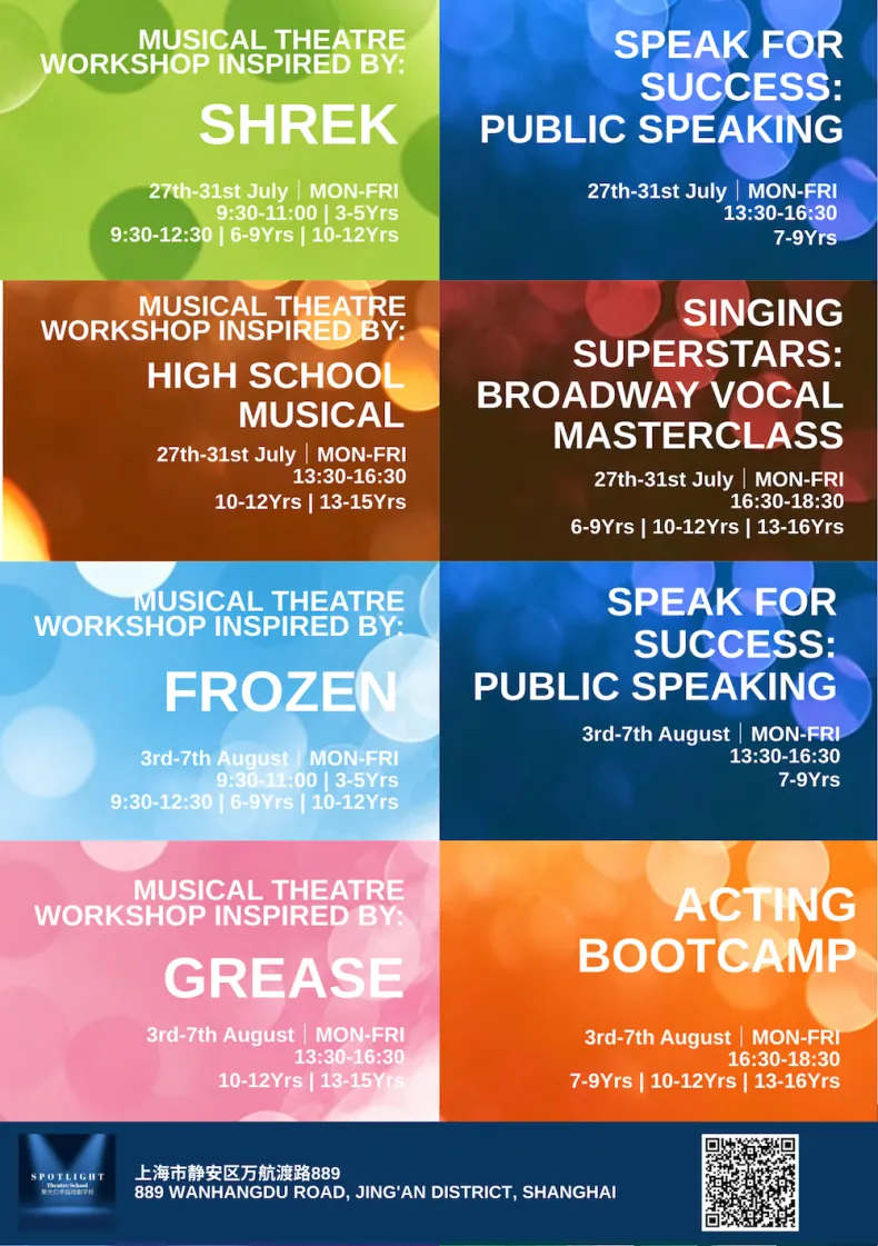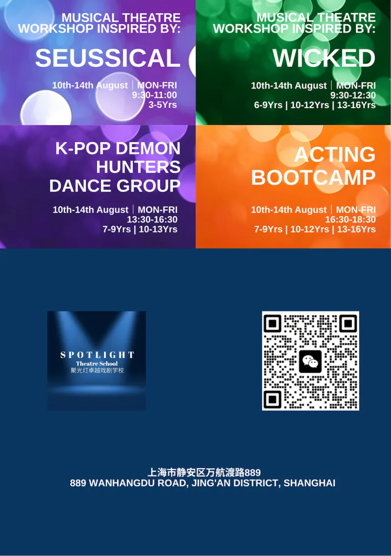 The Spotlight Studio in Jing’an is running a packed slate of summer camps from June through August, mostly geared toward kids who’d rather be on stage than anywhere else. The lineup leans heavily into musical theatre—think workshops inspired by everything from Frozen to Wicked and Matilda—alongside K-pop dance classes, acting bootcamps, and public speaking sessions. Programs are split by age (roughly 3 to 16), with half-day blocks that rotate weekly, so it’s easy enough to mix and match. Prices sit in the mid-range for this kind of thing, and the whole setup feels less like formal training, more like a structured way to burn off summer energy while picking up some performance skills on the side.