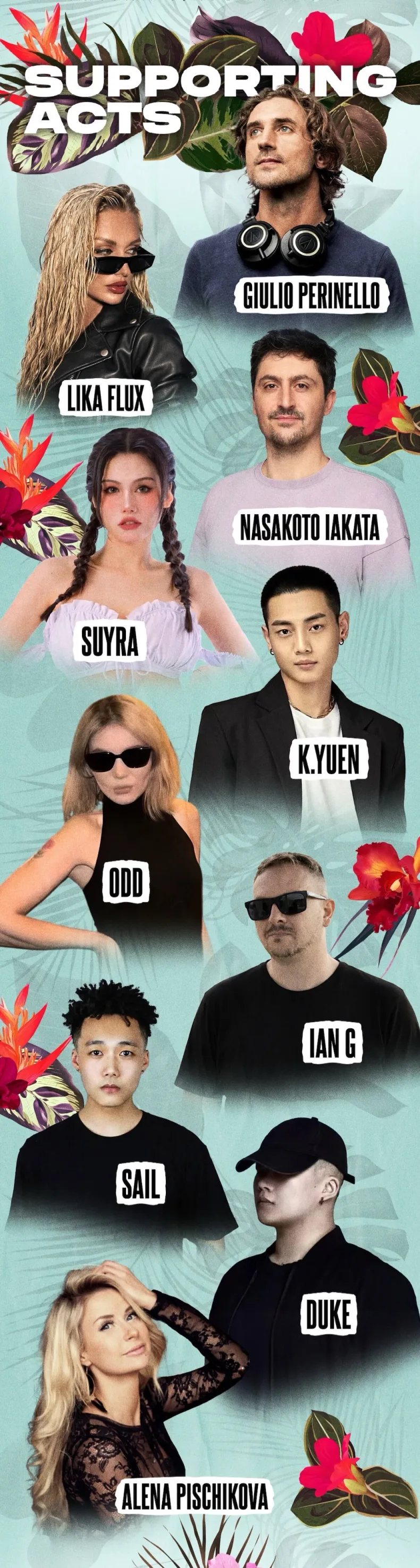 The music program includes international and supporting artists across DJ sets and live performance: