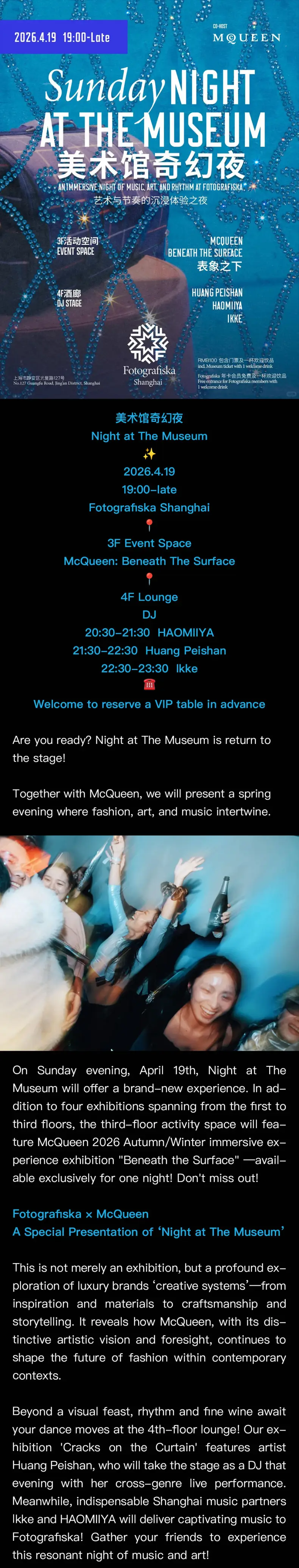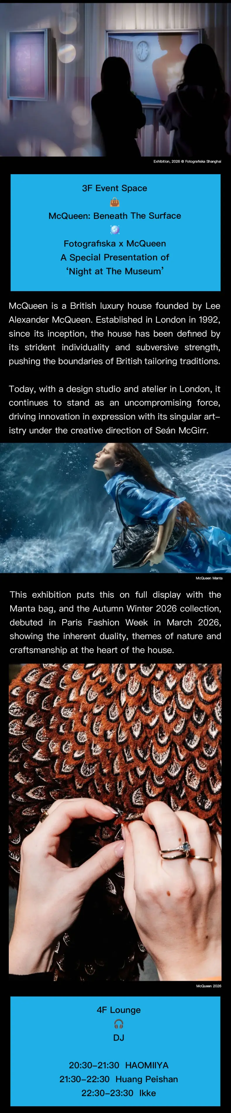 This one-night-only museum takeover brings together fashion, art, and music in an immersive late-night museum experience in collaboration with McQueen. The space features exclusive programming including Beneath The Surface alongside ongoing exhibitions across multiple floors. From 9:30pm, the 4F lounge moves into club mode with DJ sets from HAOMIIYA, Huang Peishan, and Ikke, blending experimental electronic sounds, techno, and high-energy club music deep into the night. With drinks flowing and the museum open late, it’s a full after-dark experience where art and nightlife meet.
