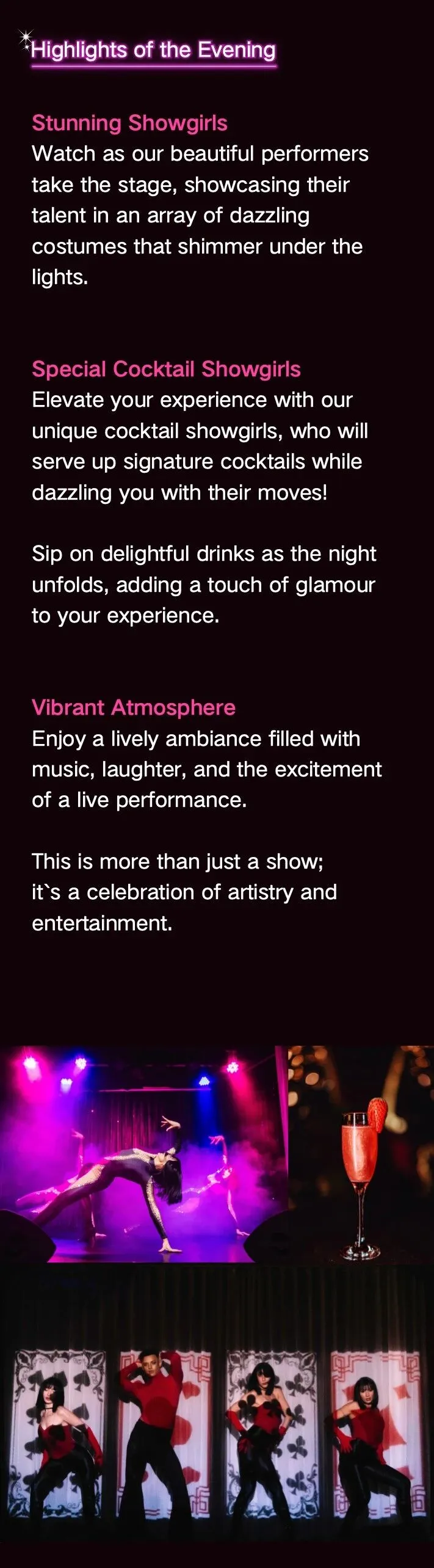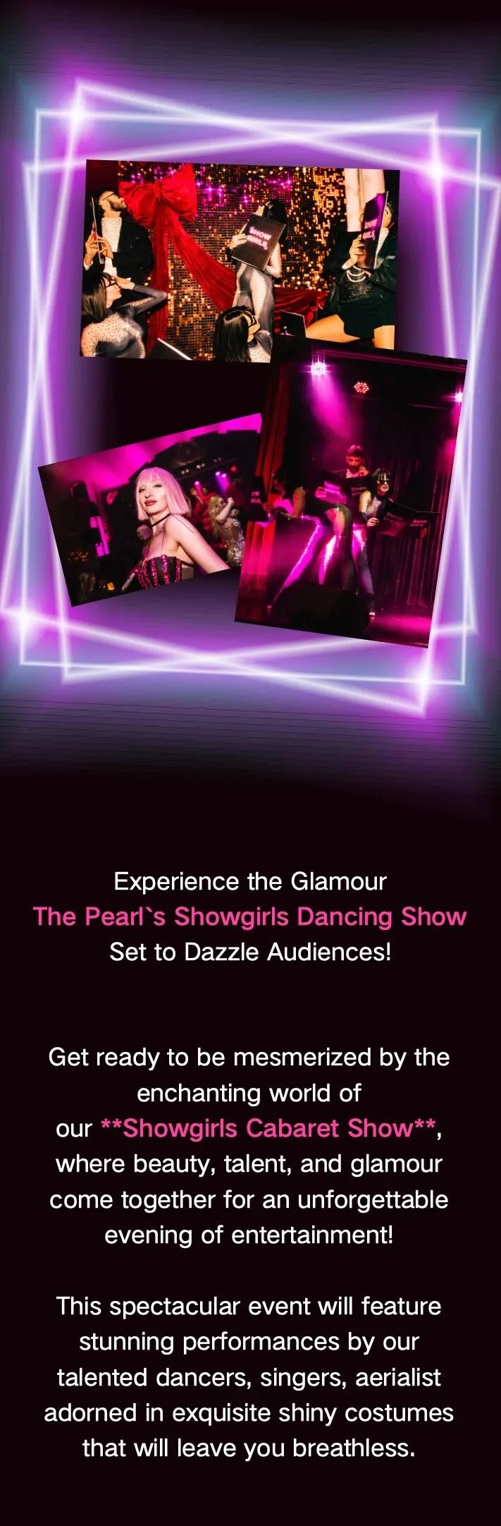 The Pearl's Showgirls Cabaret Show promises an unforgettable night of glamour, featuring dazzling performances by talented dancers, aerialists, and singers in stunning costumes. The immersive experience blends high-energy dance with the elegance of traditional showgirl performances, making for a spectacular evening. Guests can also enjoy the unique cocktail showgirls serving signature drinks while performing. It’s a night filled with excitement, elegance, and incredible artistry, offering a true celebration of entertainment.