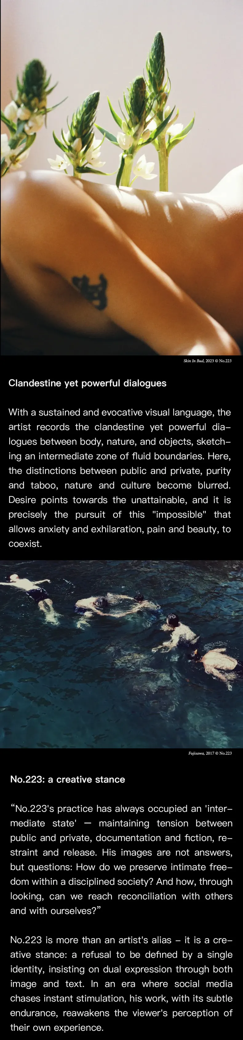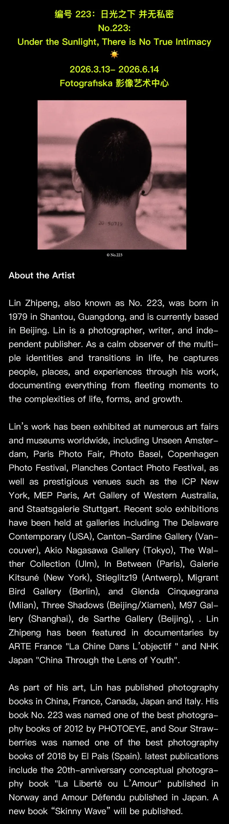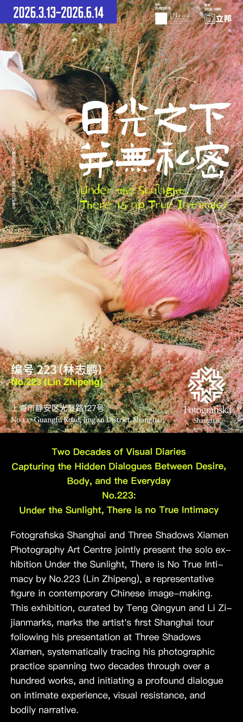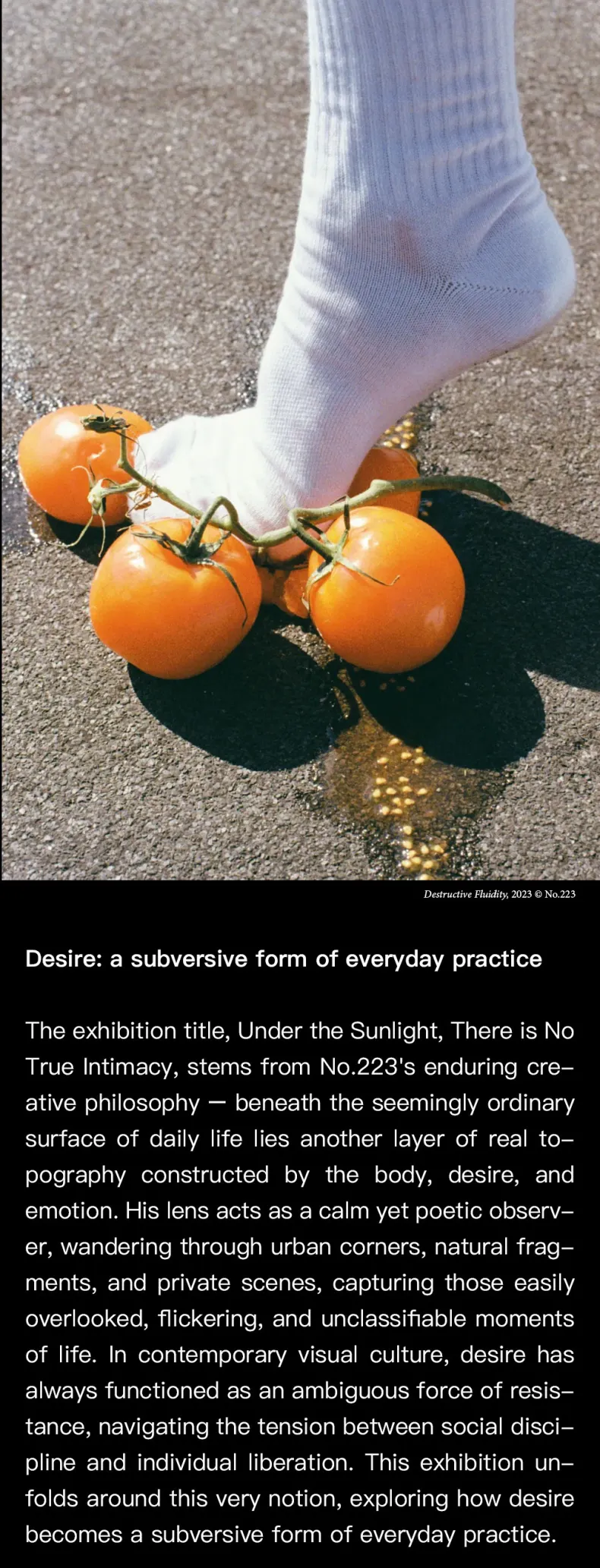 This solo exhibition presents more than two decades of photographic work by Lin Zhipeng, also known as No.223. Through over a hundred images, the show traces his ongoing exploration of desire, intimacy, and everyday moments that often go unnoticed. Moving between private scenes, urban corners, and fragments of nature, the exhibition looks at how the body, emotion, and daily life quietly shape personal experience.