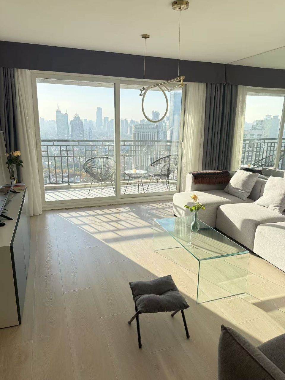 Joffre Garden is in most central downtown with IAPM shopping mall and middle Huai Hai road business street face to face, you have everything here, including metro line 1,10 and 12, shopping mall, supermarket, restaurants, department store, park etc. This is a very modern 3 bedrooms with nice view from the open balcony , apartment is very comfortable with good quality and modern furniture, the whole apartment is with central aircon and floor heating , open kitchen with oven and water filter and nice bar very bright apartment with Good "Feng shui" that will bring you wealth and good luck