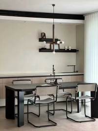 Micro-cement walls + recessed lighting; open wet bar + floor-to-ceiling windows—ideal for entertaining!