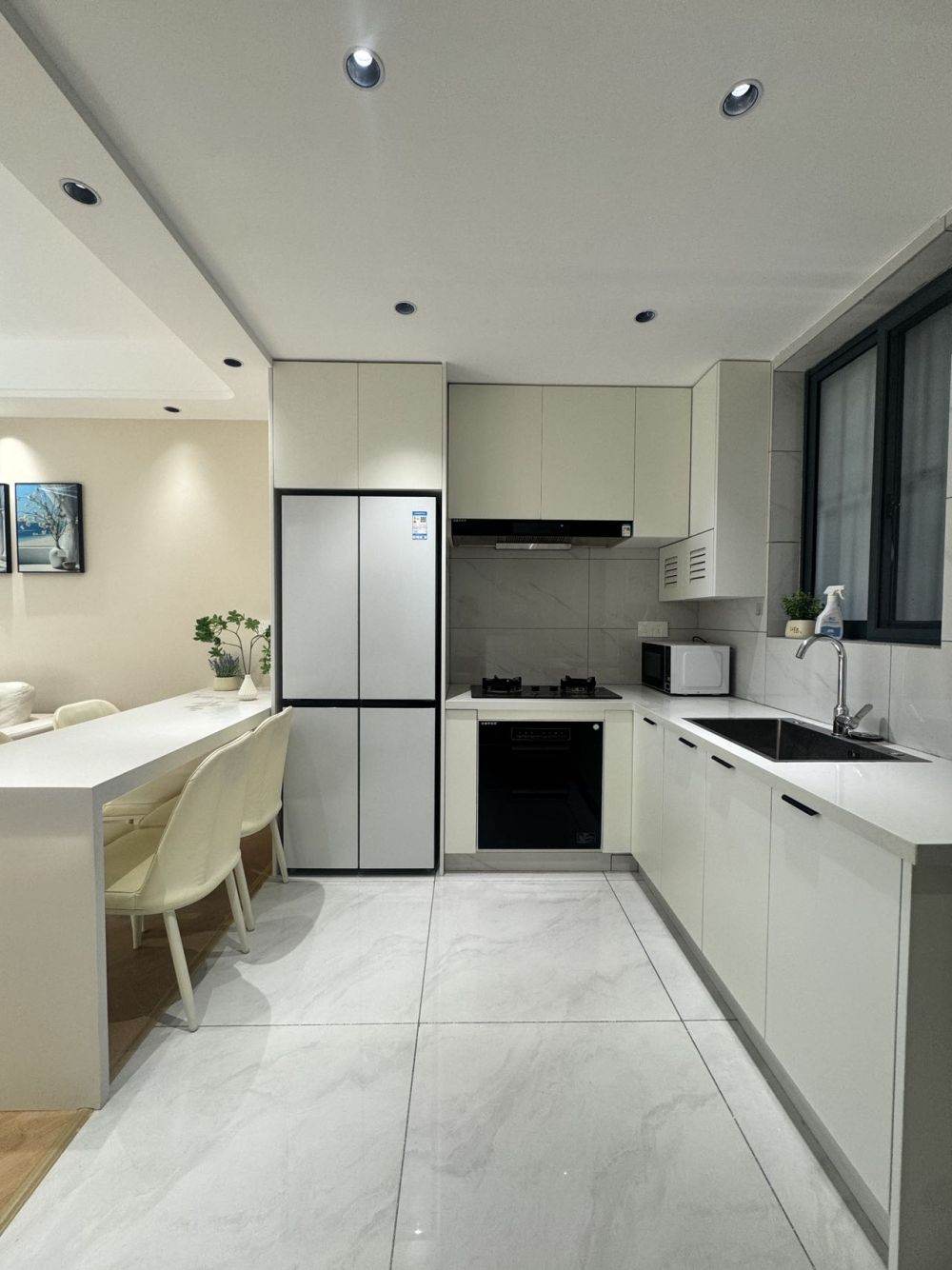 Nice, clean modern style furniture, mostly white and very bright.