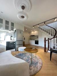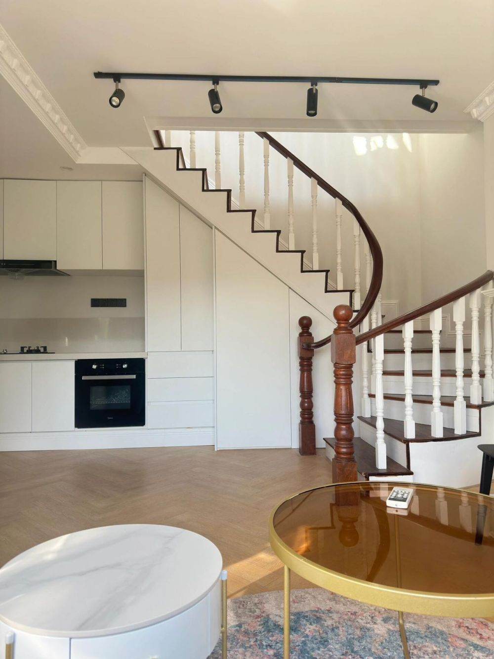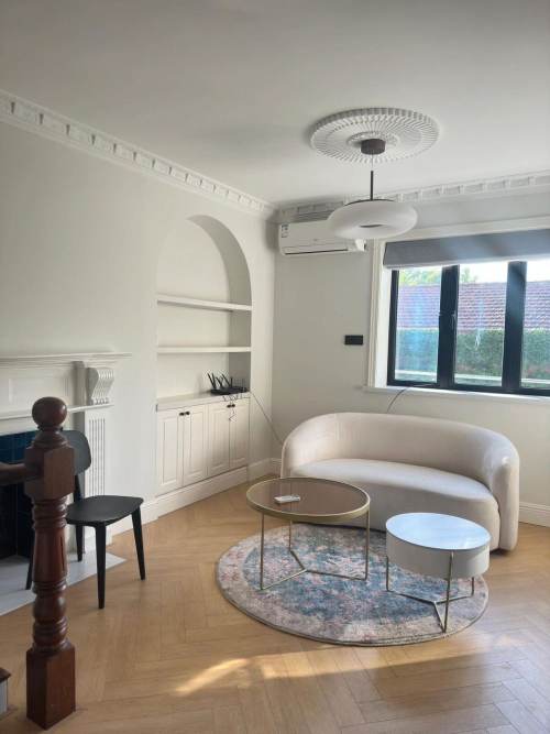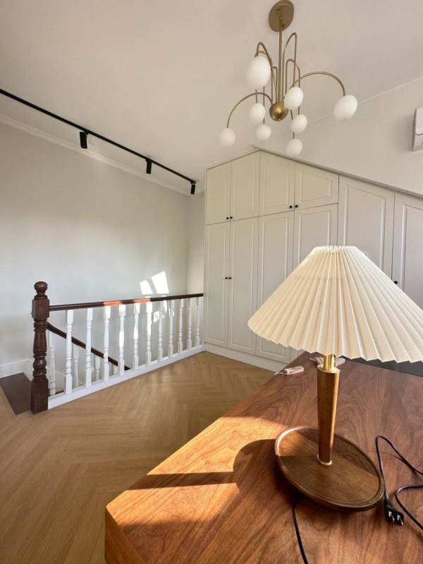 It is one spacious house of duplex structure that the first floor is the living room and the kitchen and the second floor includes the bedroom and one study. Sunshine can fill all the house the whole day since there is no high buildings in front even in this golden block. Walking south from the compound you can reach Plaza 66 the best spot to experience the luxury living style in west Nanjing Road. There is western kitchen, US fridge and the cooking space is beside the window facing south.