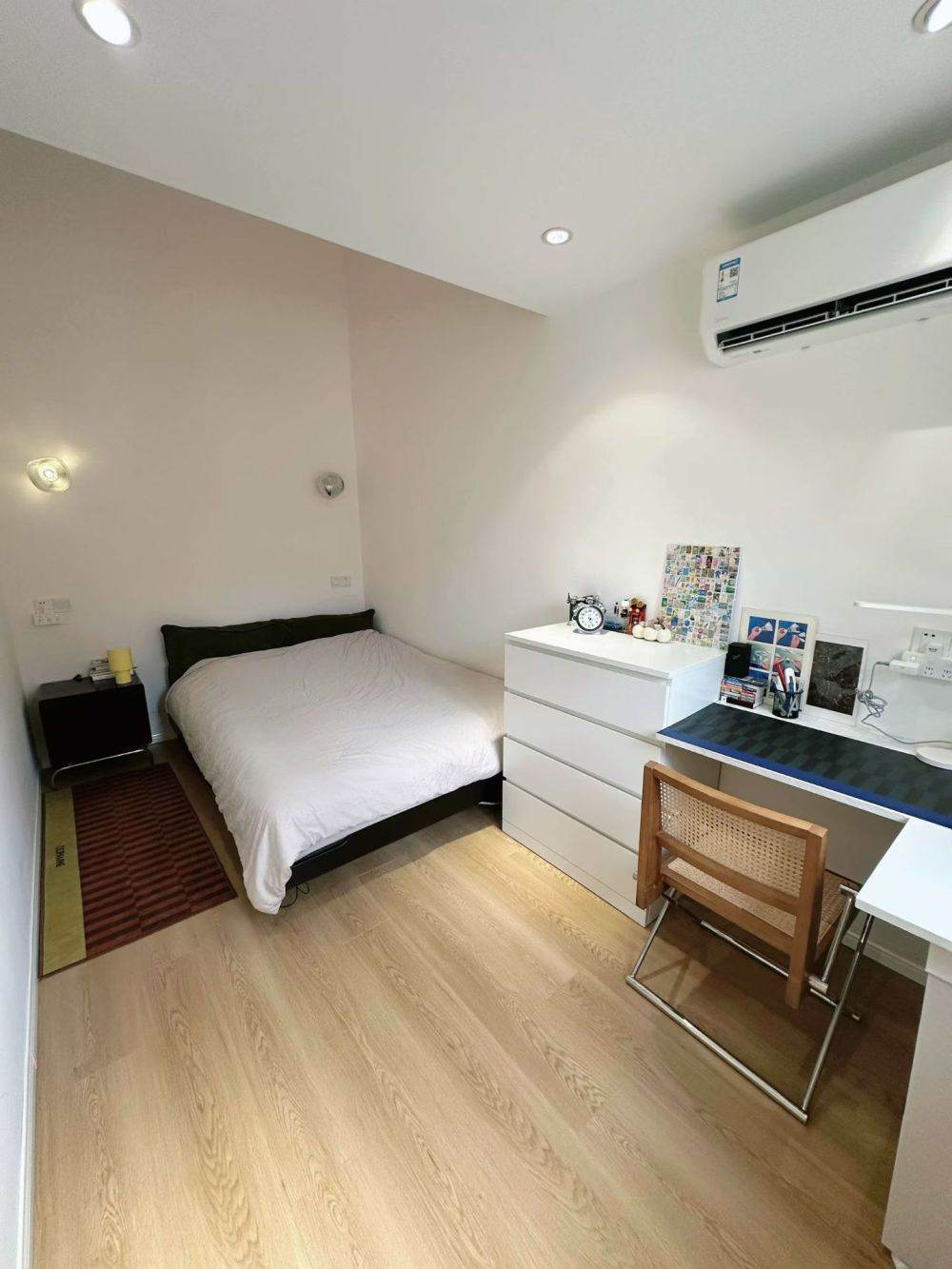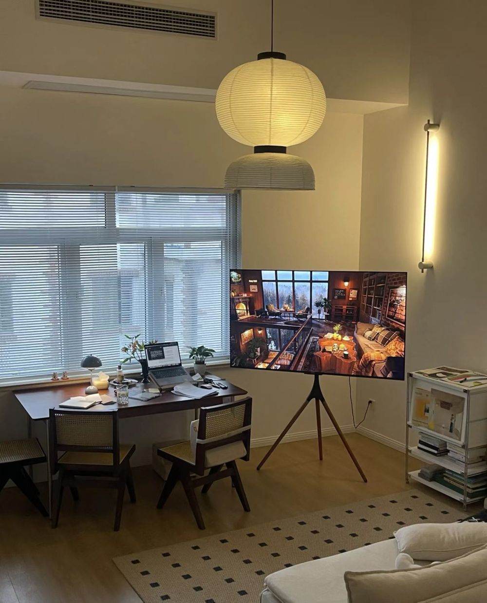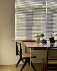 • Style: Bright, warm, and minimalist decor with natural light, wooden flooring, and a cozy living space.