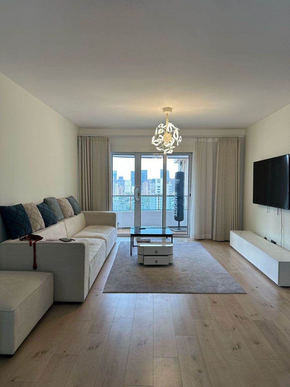 This apartment is in Jingan district. You only need 5 minutes walk to Changping Rd subway station . There are many shopping malls ......bars ,shops ,banks .....This compound is very good . It has free club which include gym ,tennis court ,swimming pool. This apartment has 3 bedrooms 2 bathrooms, floor heating ,oven, outdoor balcony , very homey and clean .If you like it ,you can contact me at any time.