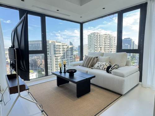 Central AC, floor heating, cozy decoration, really bright, fully equipped, high floor with a good view, oven and microwave.