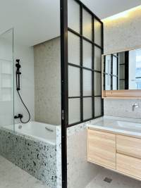 Good layout: 65sqm, confortable bedroom, there's a separate living room with dining area which full of light, well-equipped open kitchen with oven installed, modern bathroom with bathtub and shower.