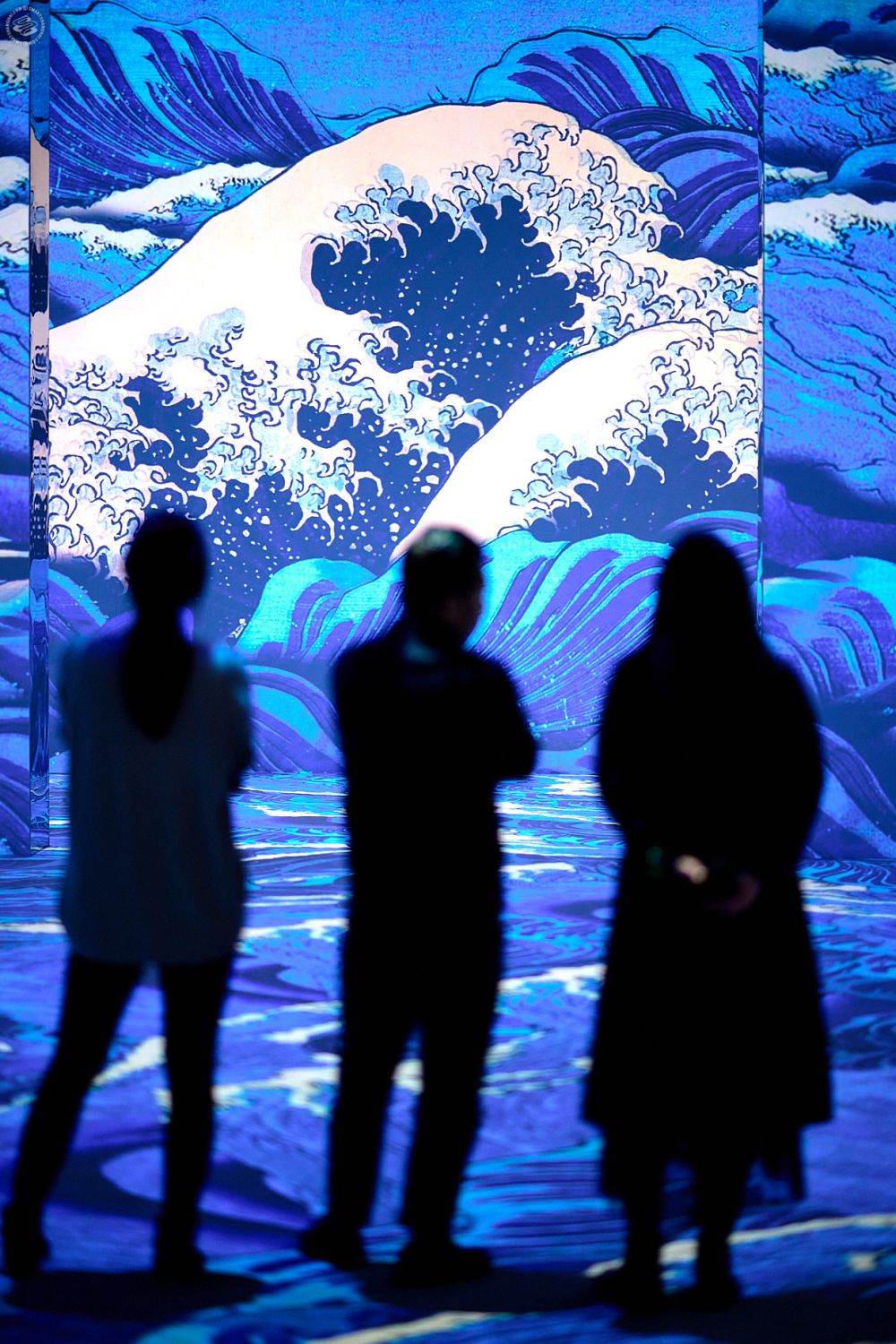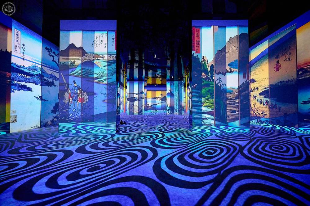The installation has two pieces: "Ukiyo-e Visions" and "Mutations." "Ukiyo-e Visions" comprises the bulk of the piece and is massive renderings of 17th-19th century Japanese print art, replete with Great Waves of Kanawaga, exploding sakura trees, and feudal conflict. "Mutation", coming from a totally different, very much more Kraftwerk kind of place, is an abstract, absolutist screen-saver, ASMR bliss-ride that takes you over with spinning geometric shapes, waves, and angles.