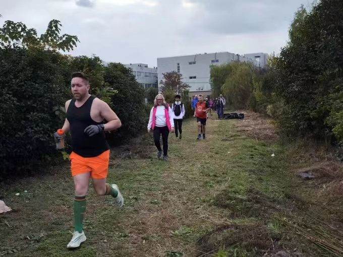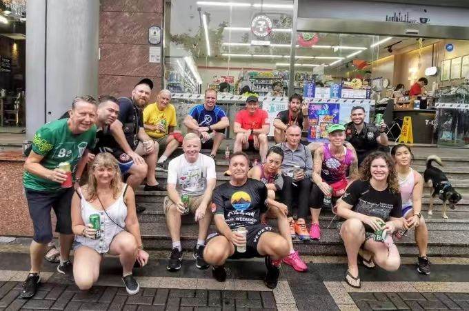 The Shanghai Hash House Harriers go on a run every single Sunday and have been doing so for over 20 years. Because of frequent stops, they say "anybody can do the run" -- at least those in decent shape -- even for runs over 10k. A run usually takes an hour and a half, with checkpoints for everyone to catch up, take a breath, and find the next mark, or have the occasional beer at an Alldays.
