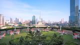 The eighth floor terrace of the Portman Ritz-Carlton is a lush hemisphere of green grass,...