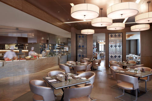 An all-day-dining restaurant with show kitchens and live cooking stations for breakfast, lunch and dinner buffets doing international cuisine. It's also got an la carte menu.